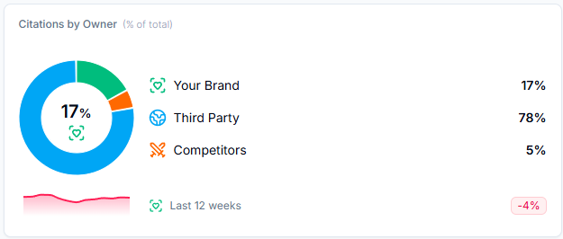 - Citations by Owner: Brand-owned citations rose to 17%, third-party sources accounted for 78%, and competitor mentions dropped to 5%. Increasing our share of first-party citations remains a key objective.