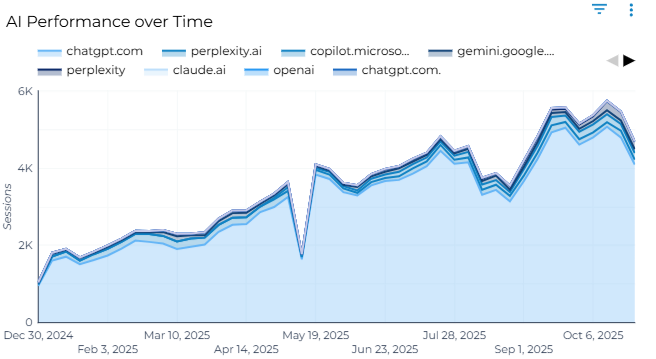 - AI Performance over Time: Sessions from ChatGPT, Perplexity, Copilot, and Gemini climbed steadily, with spikes aligning to major content and technical releases. The trend line reflects consistent growth and compounding improvements.