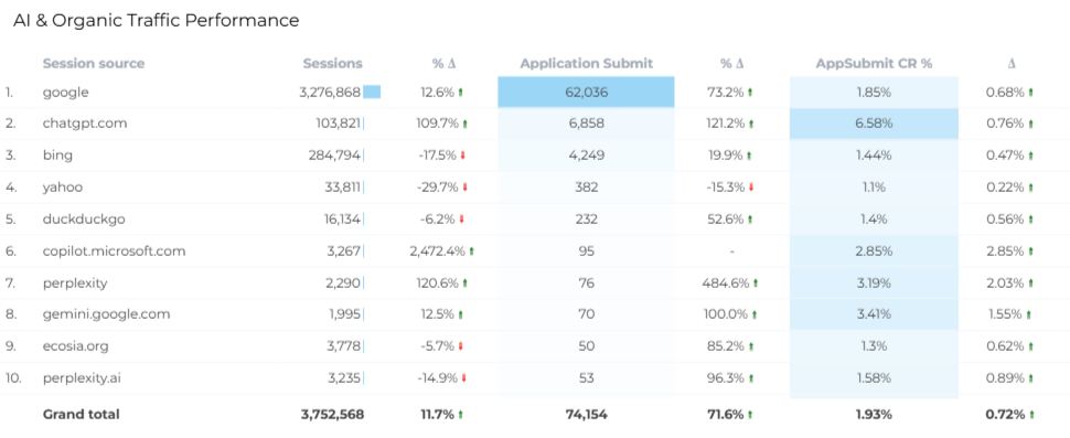 While sessions grew a modest 11.7%, the real story was the higher intent behind those sessions. Students arriving from AI assistants now understood cost, programs, and accreditation before landing on the site, making them far more likely to convert.