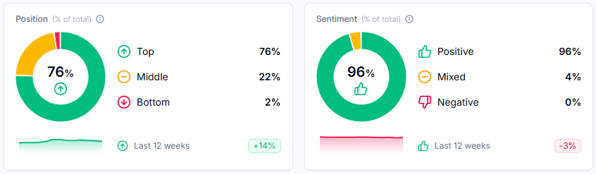 - Position & Sentiment: In the most recent quarter, 76% of answers appeared in the top position, 22% in the middle, and only 2% at the bottom. Sentiment analysis showed 96% positive or mixed responses, demonstrating strong brand alignment.